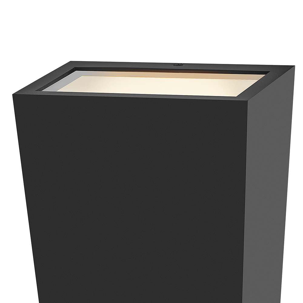 Cruz catches the eye with its modern, sleek design and trapezoidal silhouette. Available in Black and Textured White finish options, Cruz emits a beautiful wall wash illumination through the etched glass to enhance modern façades. Mounting versatility allows individuals to display either the small or large side up or down. LED bulb is included.