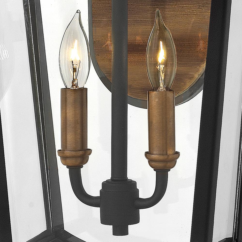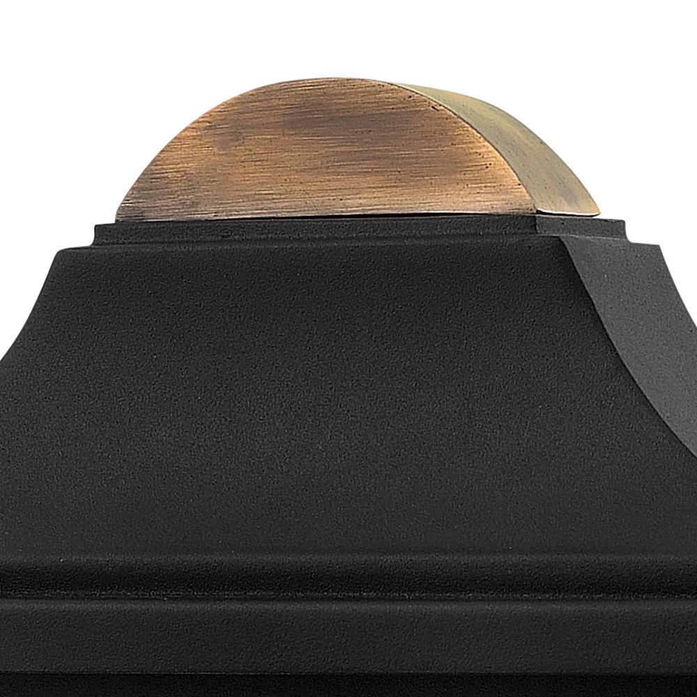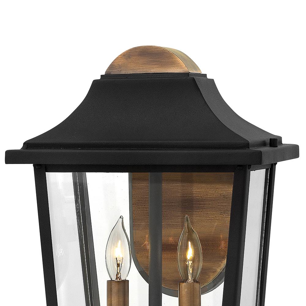 Burton’s classic cast aluminum construction in a robust Black finish is complemented by elegant touches. The distressed copper accents on the backplate, roof and socket cover paired with clear beveled glass complements the traditional styling.