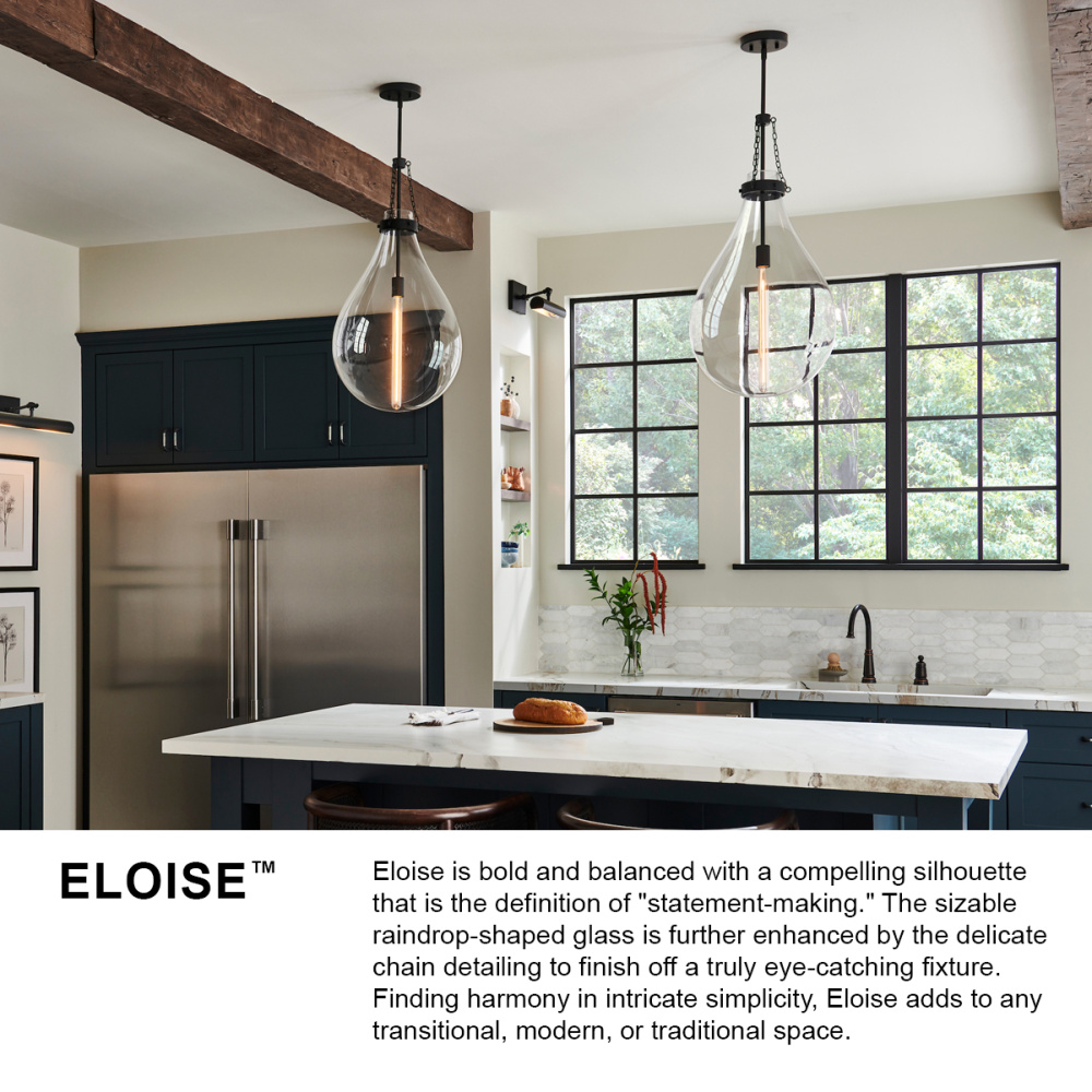 Eloise is bold and balanced with a compelling silhouette that is the definition of “statement-making.” The sizable raindrop-shaped glass is further enhanced by the delicate chain detailing to finish off a truly eye-catching fixture. Finding harmony in intricate simplicity, Eloise adds to any transitional, modern, or traditional space.