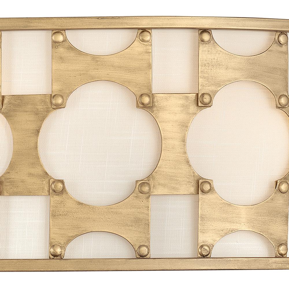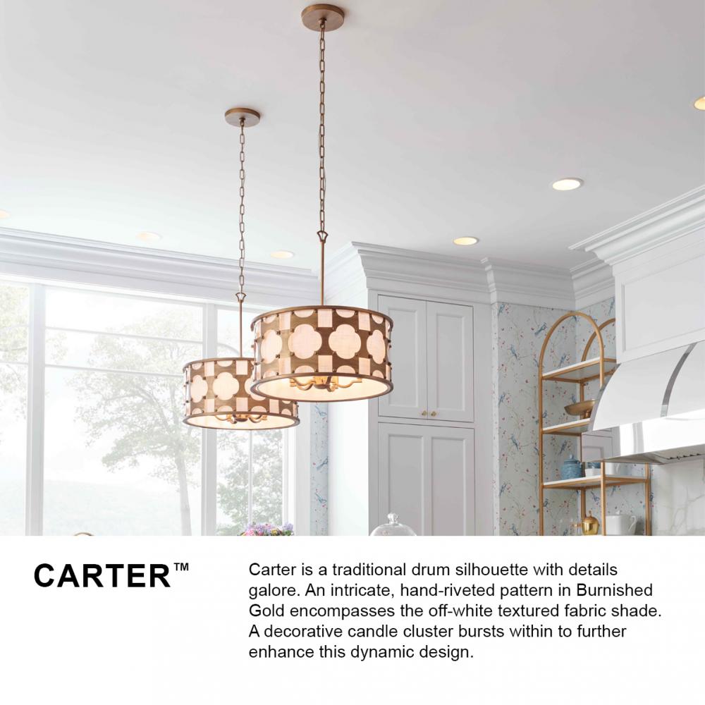Carter is a traditional drum silhouette with details galore. An intricate, hand-riveted pattern in Burnished Gold encompasses the off-white textured fabric shade. A decorative candle cluster bursts within to further enhance this dynamic design.