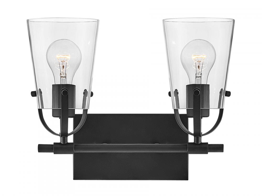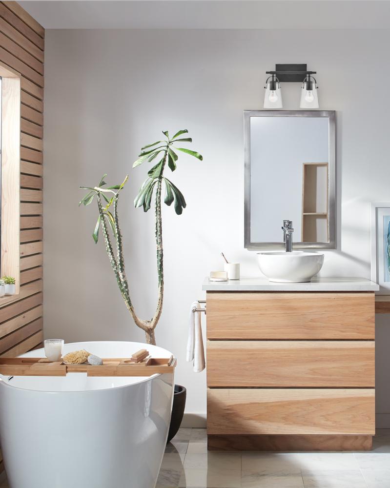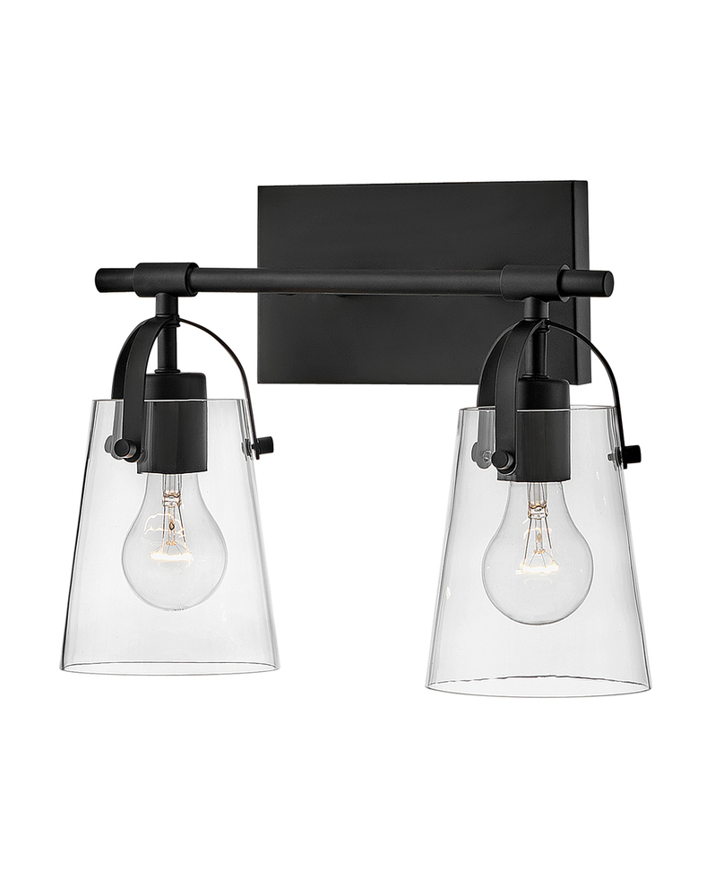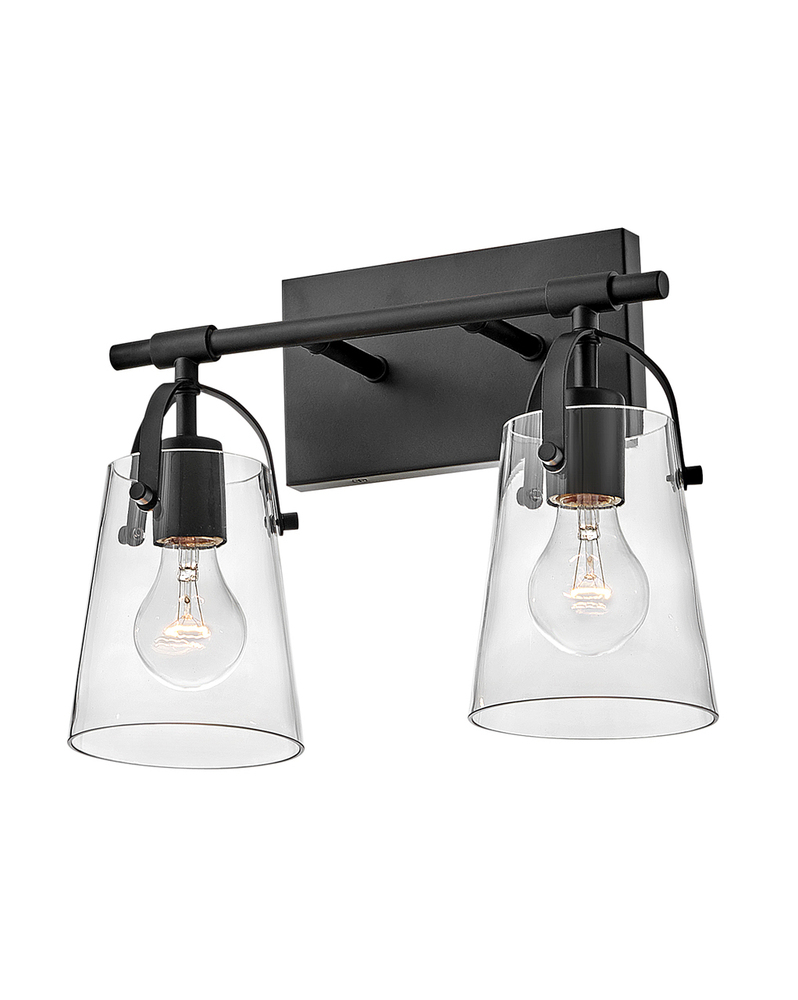 Clean and airy, Foster breathes composed simplicity into any bath space. Softly tapered glass shades suspended from arched handle prongs create a sophisticated transitional silhouette, enhanced by practical yet stylized details.
