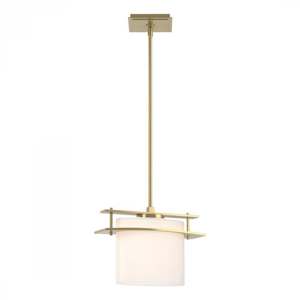 A horizontal steel bar connects tube to glass. The line of the steel plate racing across the glass makes it look as though metal has passed through glass of the pendant rather than the other way around. Crafted by our artisans here in Vermont.