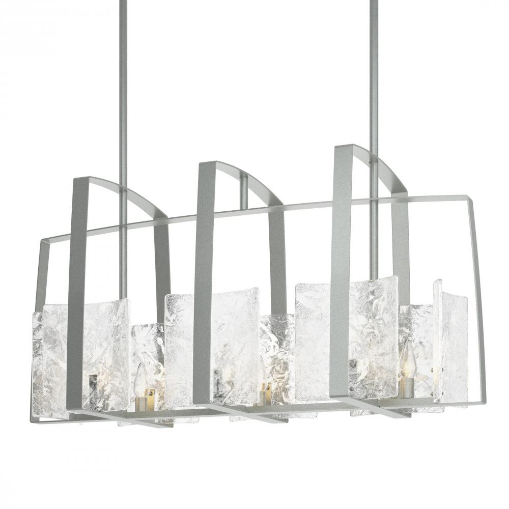 Sweeping arcs of steel and classic lines envelope eight elegant pieces of clear glass with flowing white swirls. The Arc Linear Pendant features eight candelabra sockets and is suited to a variety of settings. Available in all standard finishes.