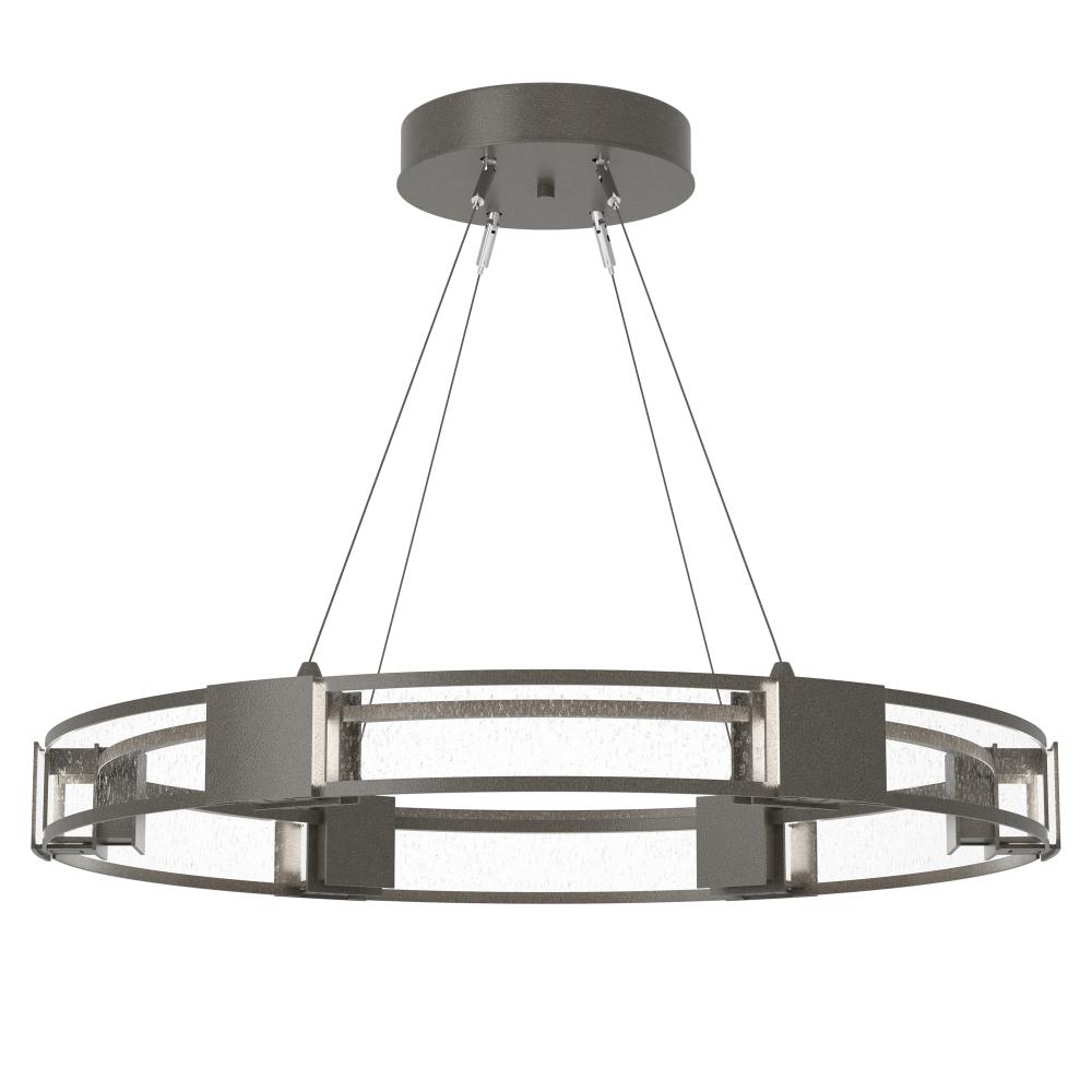 The popular Aura with a contemporary glass brightens any space. With lighting as functional as it is beautiful, the Aura's light is dispersed via its curved, double glass panels offered in either frosted or clear seeded glass. Six handcrafted steel elements serve to shade and adorn this stunning ceiling fixture.