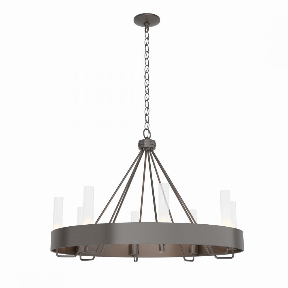 As at home in a modern lodge with exposed beams, as in a contemporary city loft, the Banded Ring Chandelier is far-reaching in its appeal. Clean lines radiate upward from a wide steel band, as candelabra bulbs warmly illuminate within 8 glass cylinders. Available in clear or opal glass options.