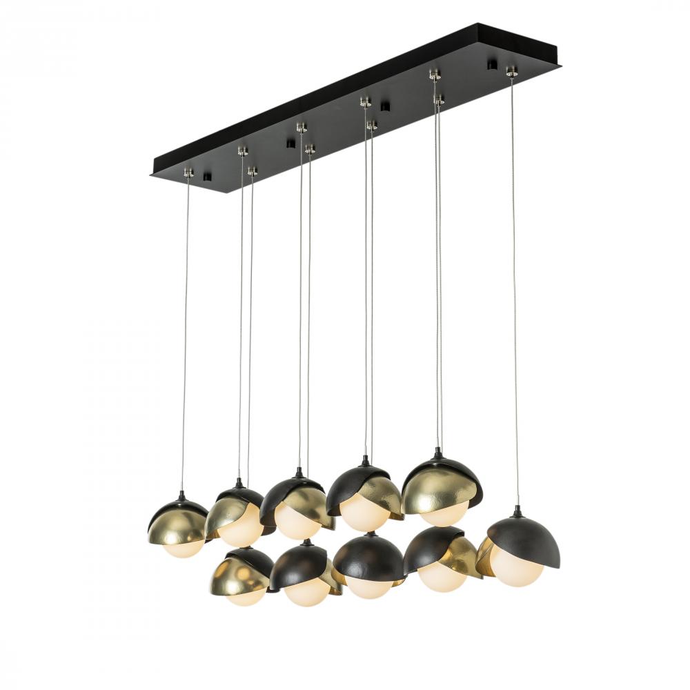 The Brooklyn Collection features fixtures in many sizes and formats, including this large 10-Light Double Shaded linear version. With its rectangular pendant above, ten individual pendants can be aligned or staggered to suit the design at customizable heights on each cable. The Brooklyn Double Shade is available as a two-tone option, with shades that can be in contrasting finishes, if desired. Vermont artisans hand-forge and texture each shade. Available in any standard finish.