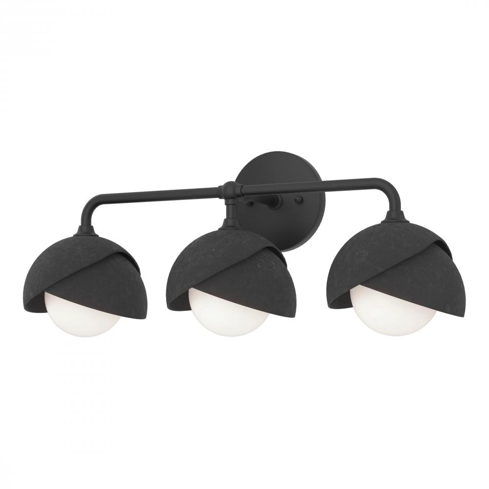 With an overarching curved arm, this Brooklyn wall mount features three 2-shaded glass globes. Shades are available in a two-tone option with a choice of accent color for a contrasting finish, if desired. Forged in 1800º fire, the shades are handcrafted and textured by Vermont makers. Available in Black, Oil Rubbed Bronze, Vintage Platinum, Soft Gold, Sterling and Modern Brass.