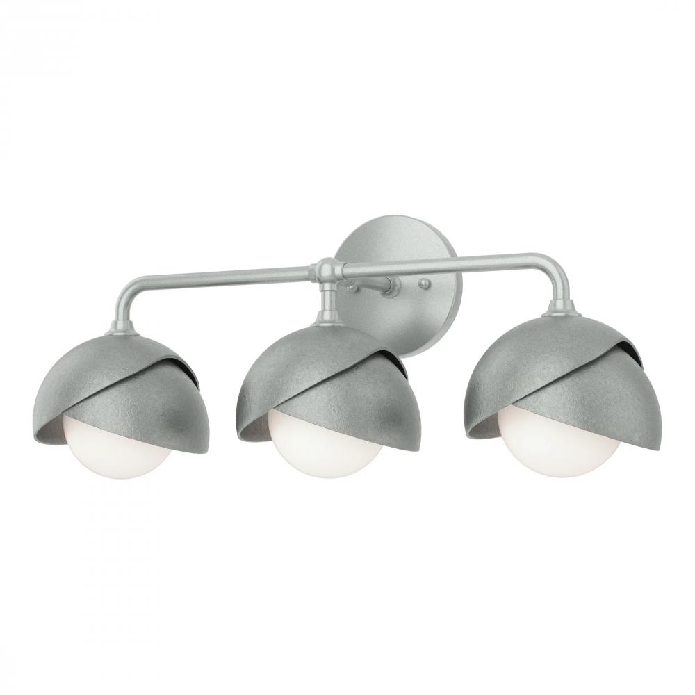 With an overarching curved arm, this Brooklyn wall mount features three 2-shaded glass globes. Shades are available in a two-tone option with a choice of accent color for a contrasting finish, if desired. Forged in 1800º fire, the shades are handcrafted and textured by Vermont makers. Available in Black, Oil Rubbed Bronze, Vintage Platinum, Soft Gold, Sterling and Modern Brass.