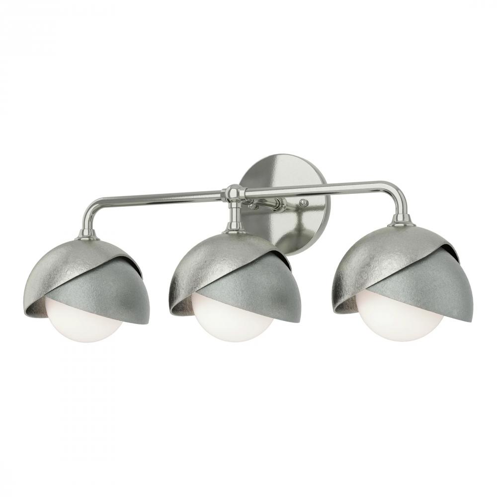With an overarching curved arm, this Brooklyn wall mount features three 2-shaded glass globes. Shades are available in a two-tone option with a choice of accent color for a contrasting finish, if desired. Forged in 1800º fire, the shades are handcrafted and textured by Vermont makers. Available in Black, Oil Rubbed Bronze, Vintage Platinum, Soft Gold, Sterling and Modern Brass.