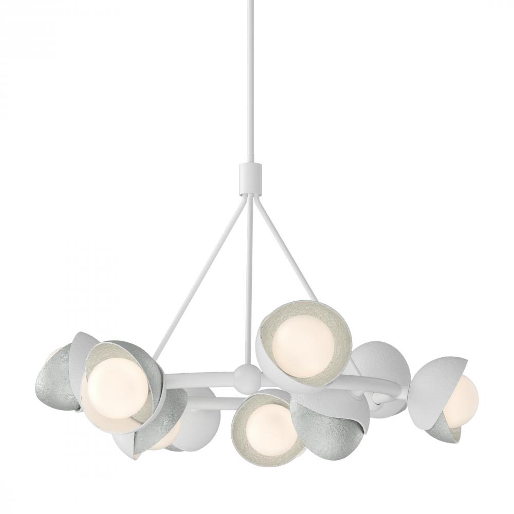 The Brooklyn Ring Pendant is a 9-light hanging fixture with a double shaded design in a circular configuration. A two-tone finish, featuring any of our 11 standard interior finish options, is available for the hand-forged and textured shades, crafted by artisans in Vermont. Multi-directional opal globes are nestled within the Brooklyn’s shades offer optimal lighting effect.