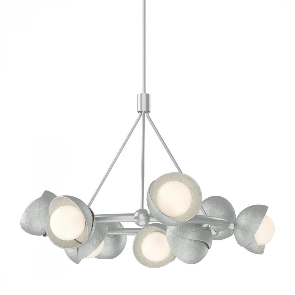 The Brooklyn Ring Pendant is a 9-light hanging fixture with a double shaded design in a circular configuration. A two-tone finish, featuring any of our 11 standard interior finish options, is available for the hand-forged and textured shades, crafted by artisans in Vermont. Multi-directional opal globes are nestled within the Brooklyn’s shades offer optimal lighting effect.