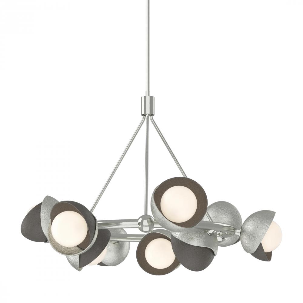 The Brooklyn Ring Pendant is a 9-light hanging fixture with a double shaded design in a circular configuration. A two-tone finish, featuring any of our 11 standard interior finish options, is available for the hand-forged and textured shades, crafted by artisans in Vermont. Multi-directional opal globes are nestled within the Brooklyn’s shades offer optimal lighting effect.