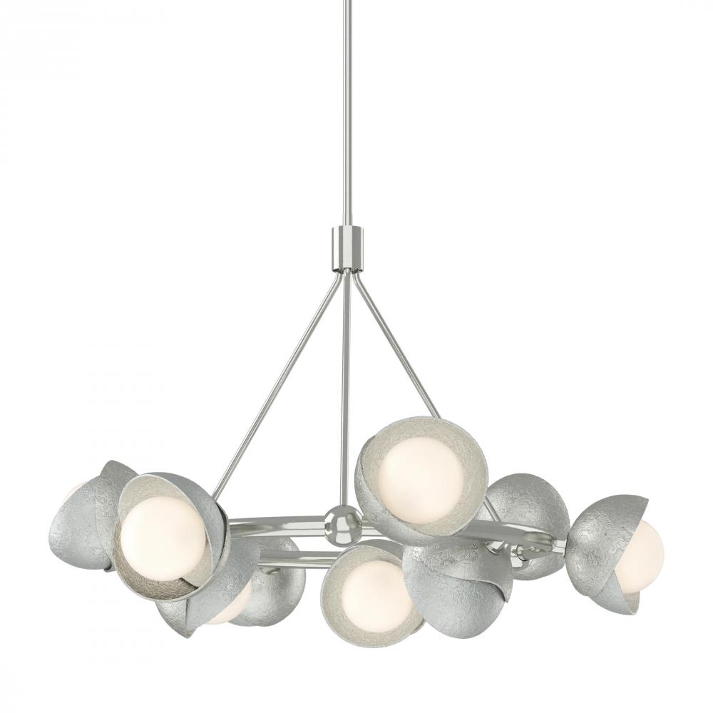 The Brooklyn Ring Pendant is a 9-light hanging fixture with a double shaded design in a circular configuration. A two-tone finish, featuring any of our 11 standard interior finish options, is available for the hand-forged and textured shades, crafted by artisans in Vermont. Multi-directional opal globes are nestled within the Brooklyn’s shades offer optimal lighting effect.