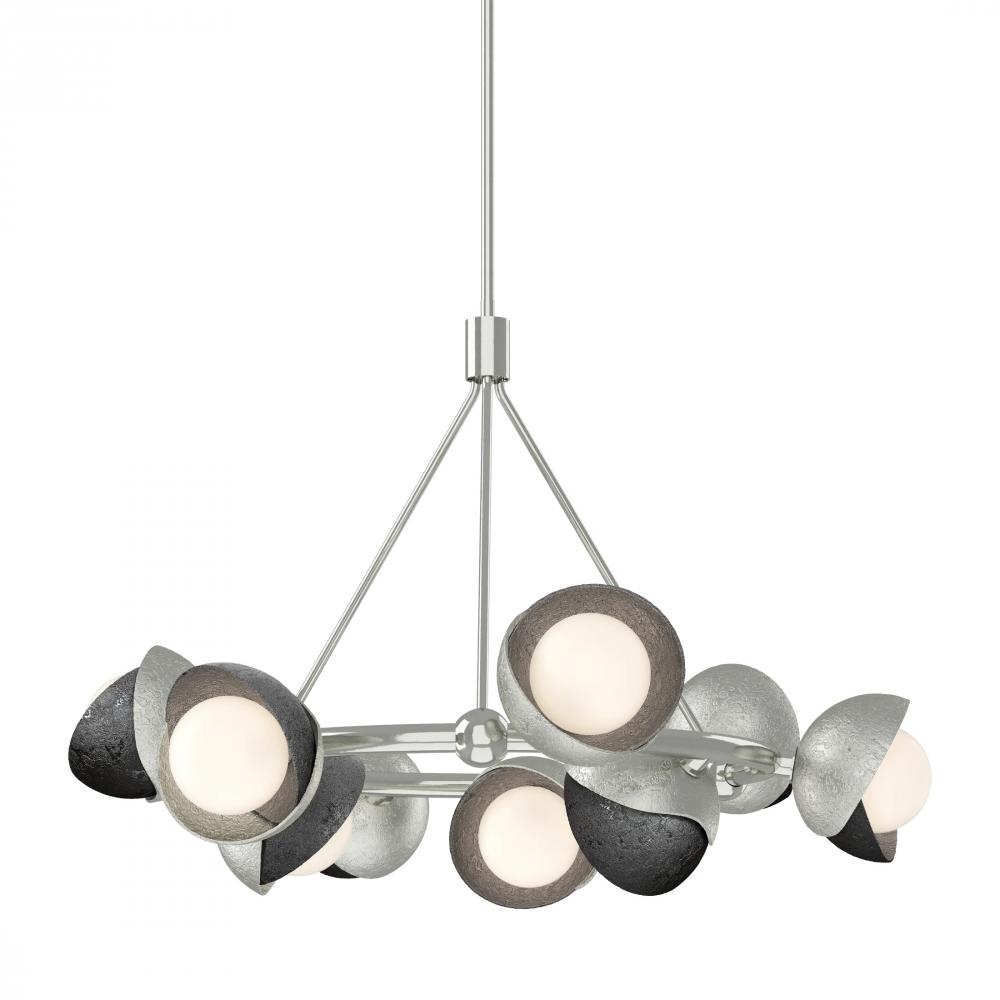 The Brooklyn Ring Pendant is a 9-light hanging fixture with a double shaded design in a circular configuration. A two-tone finish, featuring any of our 11 standard interior finish options, is available for the hand-forged and textured shades, crafted by artisans in Vermont. Multi-directional opal globes are nestled within the Brooklyn’s shades offer optimal lighting effect.