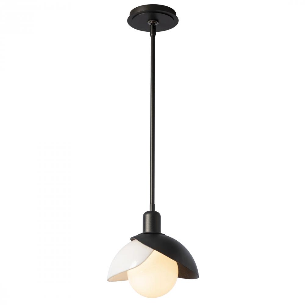 A larger single pendant, the Brooklyn Medium Double Shade Art Glass Mini Pendant features the Brooklyn's hallmark forged and textured steel shade that is uniquely paired with a contrasting white art glass shade to brilliant effect, with its exposed bulb that is nestled within the shades.