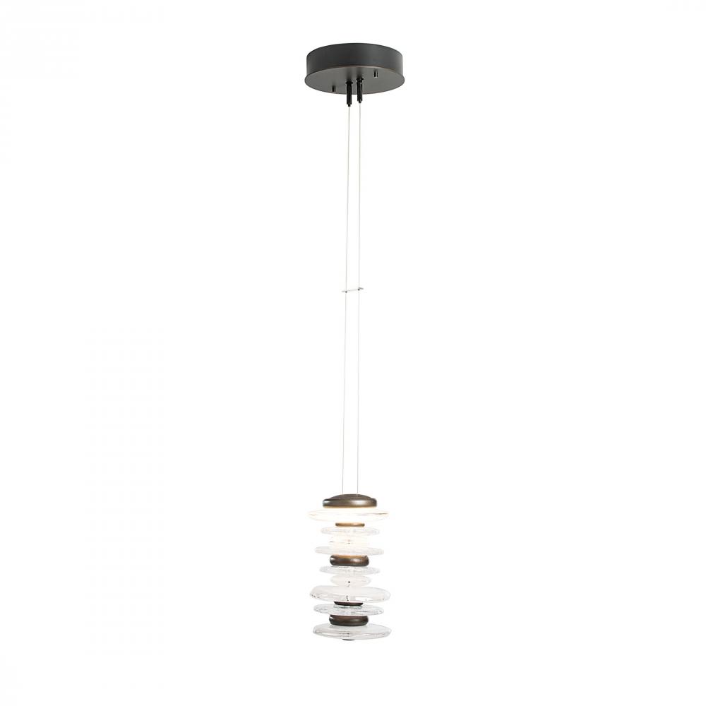 The Hubbardton Forge Cairn Pendant pays homage to the enigmatic stone sculptures, used since ancient times as landmarks. Thick hand-poured glass and cast steel “stones” are artistically stacked, and suspended by thin cables, creating a stunning illumination. Light flows over the steel and through the glass to seemingly glow from the inside. Also available as a smaller Mini Pendant.