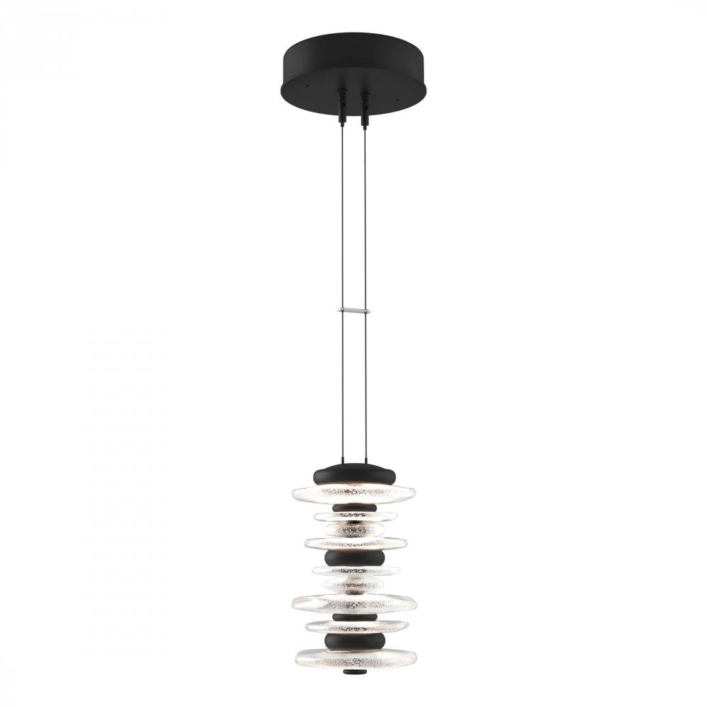 The Hubbardton Forge Cairn Pendant pays homage to the enigmatic stone sculptures, used since ancient times as landmarks. Thick hand-poured glass and cast steel “stones” are artistically stacked, and suspended by thin cables, creating a stunning illumination. Light flows over the steel and through the glass to seemingly glow from the inside. Also available as a smaller Mini Pendant.
