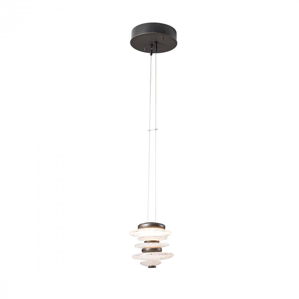 The Hubbardton Forge Cairn Pendant pays homage to the enigmatic stone sculptures, used since ancient times as landmarks. Thick hand-poured glass and cast steel “stones” are artistically stacked, and suspended by thin cables. Light flows over the steel and through the glass to seemingly glow from the inside. Also available as a Large Mini Pendant.