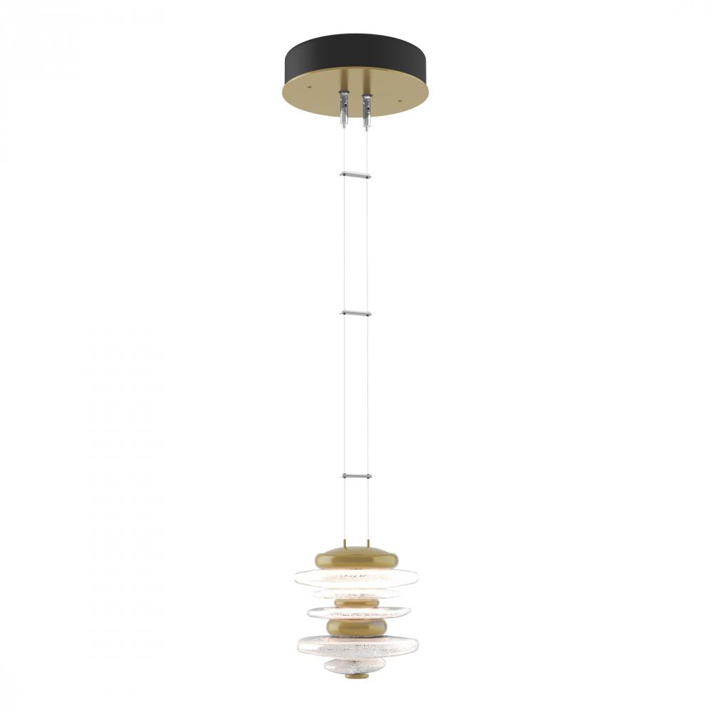 The Hubbardton Forge Cairn Pendant pays homage to the enigmatic stone sculptures, used since ancient times as landmarks. Thick hand-poured glass and cast steel “stones” are artistically stacked, and suspended by thin cables. Light flows over the steel and through the glass to seemingly glow from the inside. Also available as a Large Mini Pendant.