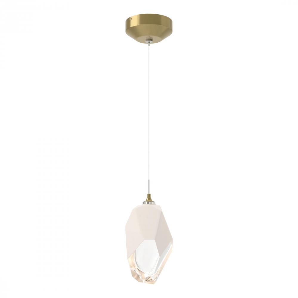 The Chrysalis 1-Light Large Crystal Pendant is a low-voltage fixture that features a large, handcrafted faceted glass crystal suspended from a small round canopy. A thick, clear layer of glass is encased in an outer cocoon of hand-blown, colored glass (matte black or white). Hand-polished like a gemstone, the lower portion of the outer layer of glass is removed to reveal the inner crystal clear layer below and is lit from within.