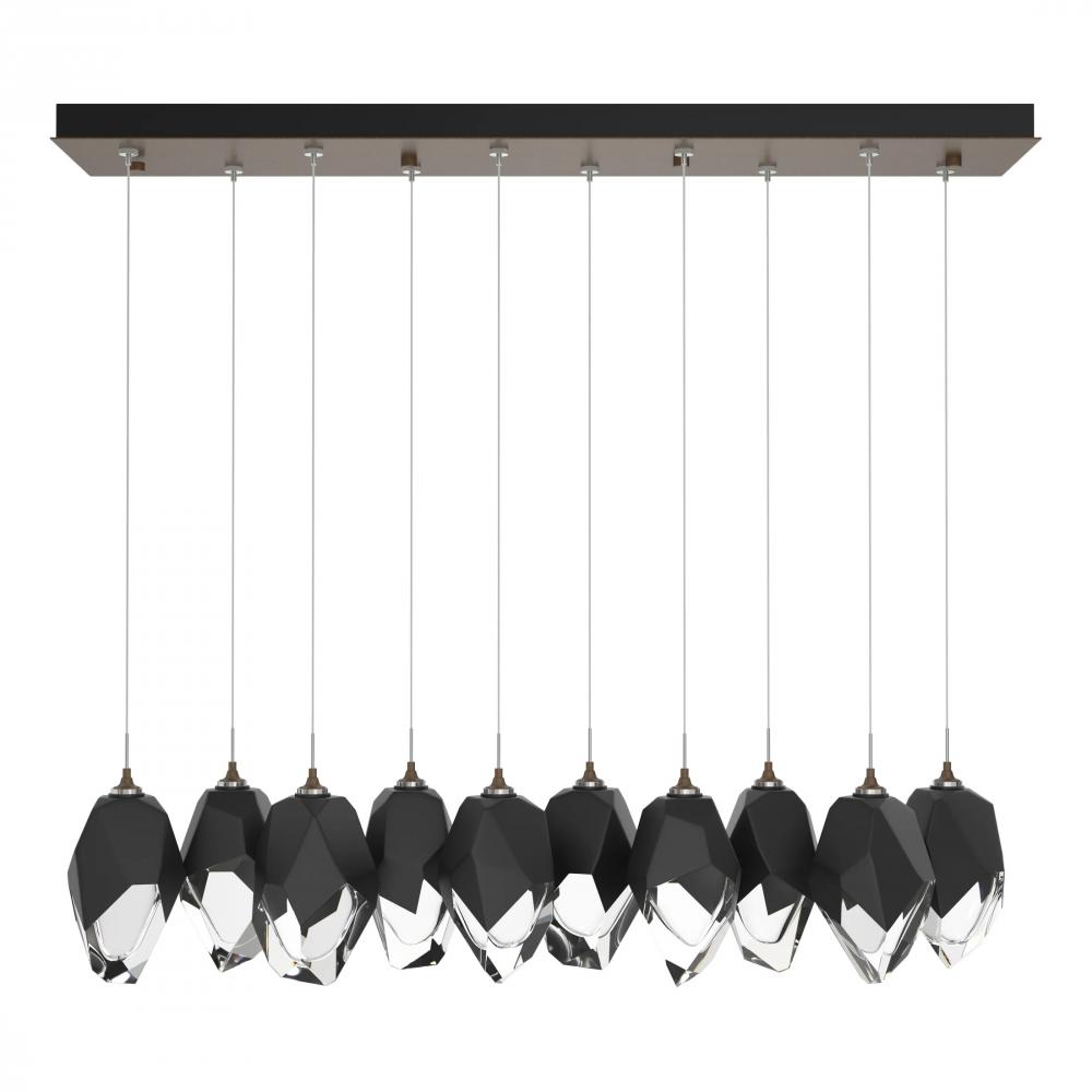 Ten Large Chrysalis pendants hung from a rectangular canopy. Each pendant may be individually adjusted for a custom look. Note, the upper canopy can will always be black while the canopy faceplate will match the selected finish.