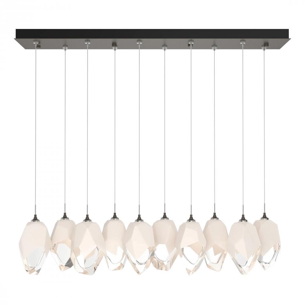 Ten Large Chrysalis pendants hung from a rectangular canopy. Each pendant may be individually adjusted for a custom look. Note, the upper canopy can will always be black while the canopy faceplate will match the selected finish.