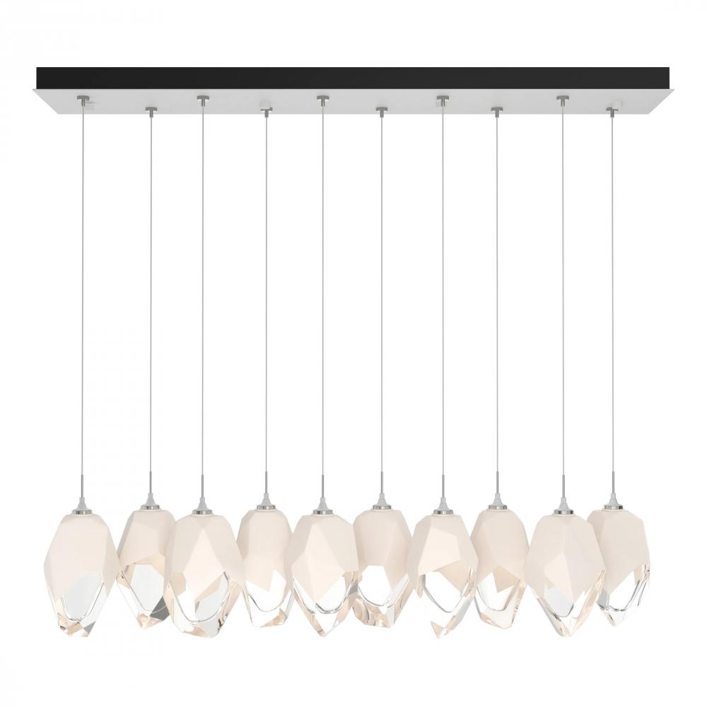 Ten Large Chrysalis pendants hung from a rectangular canopy. Each pendant may be individually adjusted for a custom look. Note, the upper canopy can will always be black while the canopy faceplate will match the selected finish.