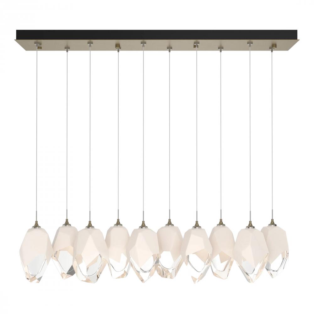 Ten Large Chrysalis pendants hung from a rectangular canopy. Each pendant may be individually adjusted for a custom look. Note, the upper canopy can will always be black while the canopy faceplate will match the selected finish.