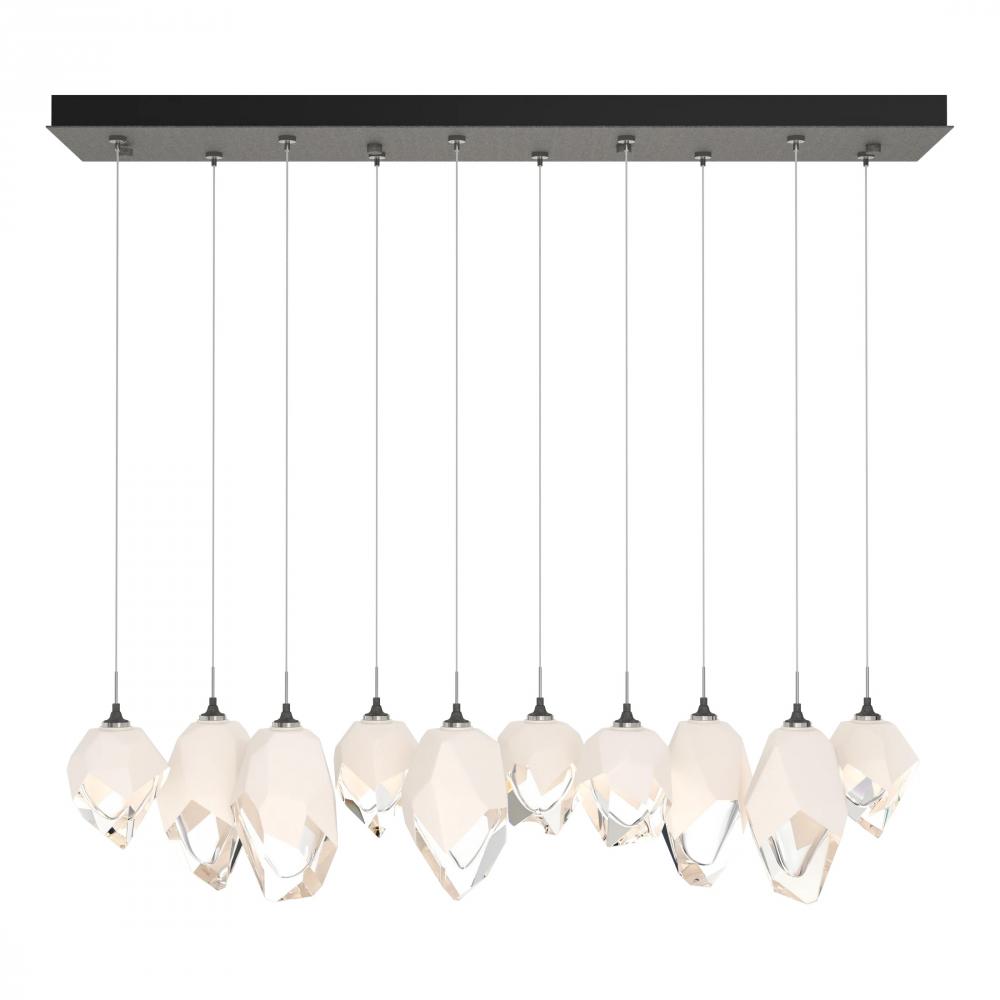 Five Large Chrysalis pendants and five Small Chrysalis pendants hung from a rectangular canopy. Each pendant may be individually adjusted for a custom look. Note, the upper canopy can will always be black while the canopy faceplate will match the selected finish.