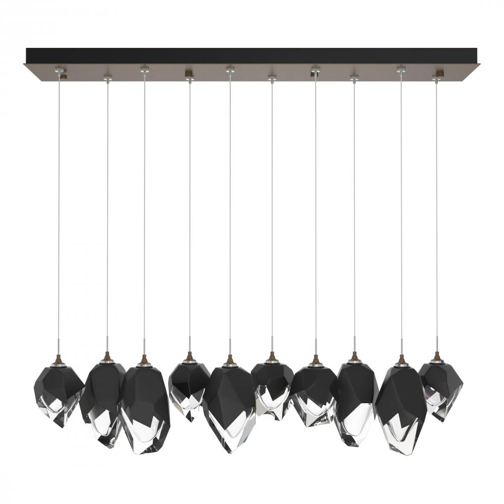 Five Large Chrysalis pendants and five Small Chrysalis pendants hung from a rectangular canopy. Each pendant may be individually adjusted for a custom look. Note, the upper canopy can will always be black while the canopy faceplate will match the selected finish.