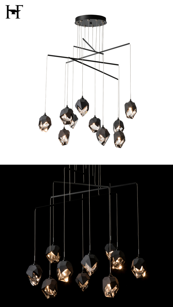 Ten small crystals, with a choice of either black or white matte outer glass layer, dance at the end of each cable guided by delicate metal tubes to its ideal drop. The mobile platform's playful nature is perfectly suited to the Chrysalis design. This artful display of crystals and light is highly-adjustable, allowing the right configuration for its space.