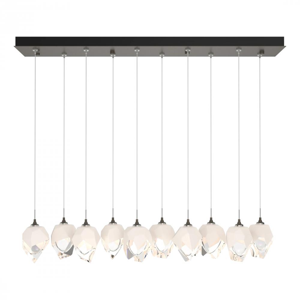 The Chrysalis 10-Light Small Crystal Pendant is a multi-port fixture that features ten small, handcrafted faceted glass crystals suspended from a rectangular canopy. A thick, clear layer of glass is encased in an outer cocoon of hand-blown, colored glass (matte black or white; all 10 are same color). Hand-polished like a gemstone, the lower portion of the outer layer of glass is removed to reveal the inner crystal clear layer below. Each crystal is lit from within.