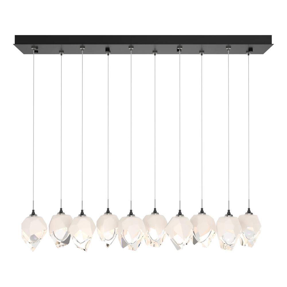 The Chrysalis 10-Light Small Crystal Pendant is a multi-port fixture that features ten small, handcrafted faceted glass crystals suspended from a rectangular canopy. A thick, clear layer of glass is encased in an outer cocoon of hand-blown, colored glass (matte black or white; all 10 are same color). Hand-polished like a gemstone, the lower portion of the outer layer of glass is removed to reveal the inner crystal clear layer below. Each crystal is lit from within.