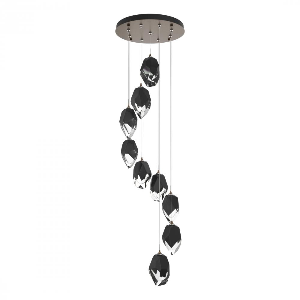 The Chrysalis 9-Light Large Crystal Pendant is the perfect focal piece for a stairwell or other central or corner space where cascading crystals lit from within create a waterfall of light when pendants are staggered. Highly-customizable, each individual pendant is suspended via low-voltage cable from its round canopy. A thick, clear layer of glass is encased in an outer cocoon of hand-blown, colored glass (matte black or white; all 9 are same color). The lower portion of the outer layer of glass is removed by hand-polishing it, revealing the inner clear layer below.
