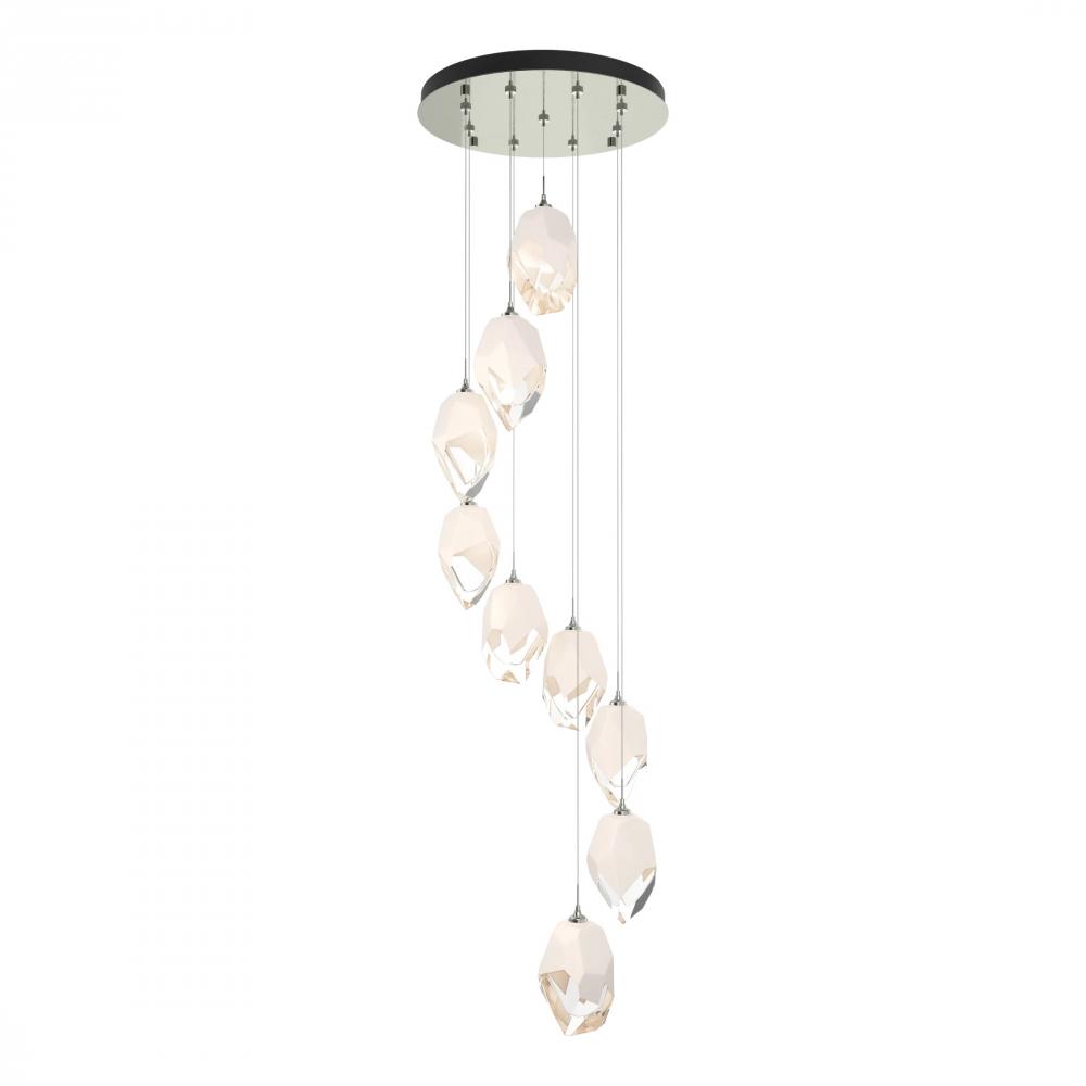 The Chrysalis 9-Light Large Crystal Pendant is the perfect focal piece for a stairwell or other central or corner space where cascading crystals lit from within create a waterfall of light when pendants are staggered. Highly-customizable, each individual pendant is suspended via low-voltage cable from its round canopy. A thick, clear layer of glass is encased in an outer cocoon of hand-blown, colored glass (matte black or white; all 9 are same color). The lower portion of the outer layer of glass is removed by hand-polishing it, revealing the inner clear layer below.