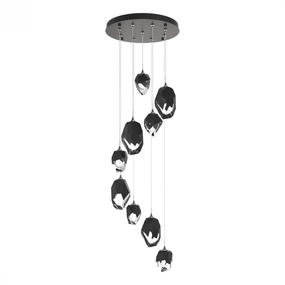 The Chrysalis 9-Light Mixed Crystal Pendant makes a statement in any stairwell or other central or corner space where cascading crystals lit from within create a waterfall of light when pendants are staggered. Highly-customizable, each individual pendant (4 large + 5 small) is suspended via low-voltage cable from its round canopy. A thick, clear layer of glass is encased in an outer cocoon of hand-blown, colored glass (matte black or white; all 9 are same color). The lower portion of the outer layer of glass is removed by hand-polishing it, revealing the inner clear layer below.