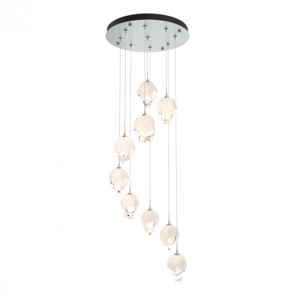 The Chrysalis 9-Light Small Crystal Pendant is the perfect focal piece for a stairwell or other central or corner space where cascading crystals lit from within create a waterfall of light when pendants are staggered. Highly-customizable, each individual crystal light is suspended via low-voltage cable from its round canopy. A thick, clear layer of glass is encased in an outer cocoon of hand-blown, colored glass (matte black or white; all 9 are same color). The lower portion of the outer layer of glass is removed by hand-polishing it, revealing the inner clear layer below.
