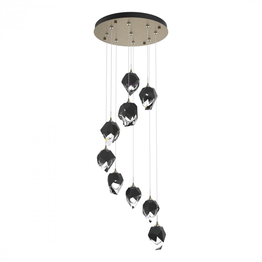 The Chrysalis 9-Light Small Crystal Pendant is the perfect focal piece for a stairwell or other central or corner space where cascading crystals lit from within create a waterfall of light when pendants are staggered. Highly-customizable, each individual crystal light is suspended via low-voltage cable from its round canopy. A thick, clear layer of glass is encased in an outer cocoon of hand-blown, colored glass (matte black or white; all 9 are same color). The lower portion of the outer layer of glass is removed by hand-polishing it, revealing the inner clear layer below.