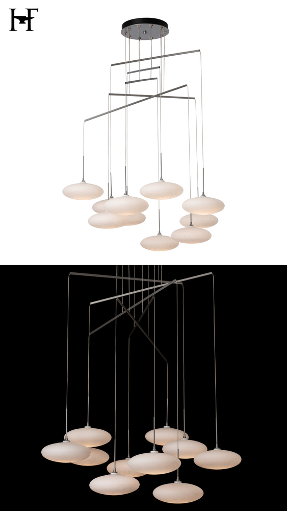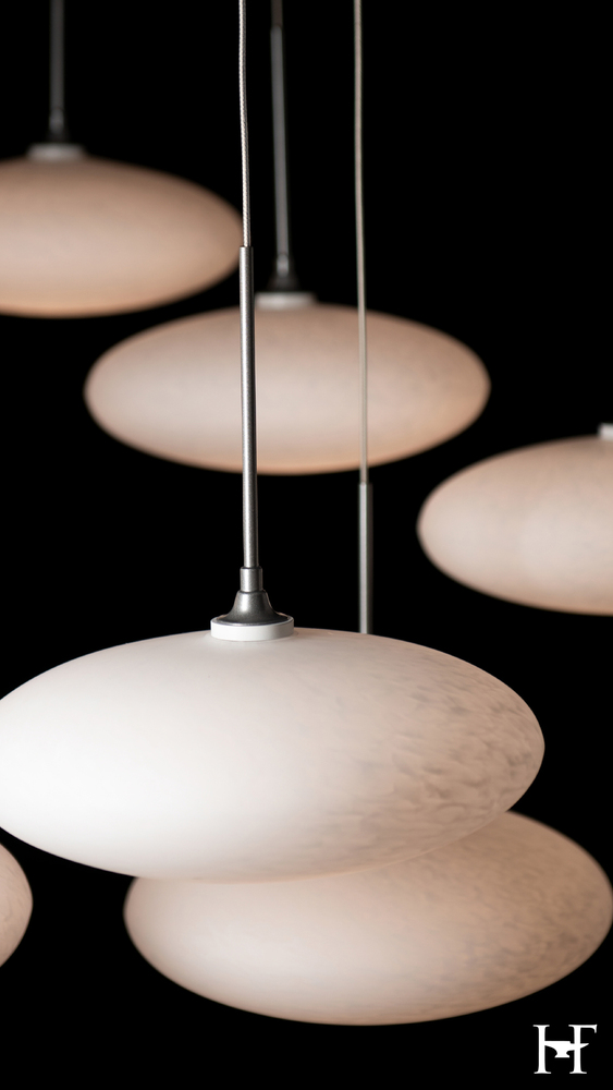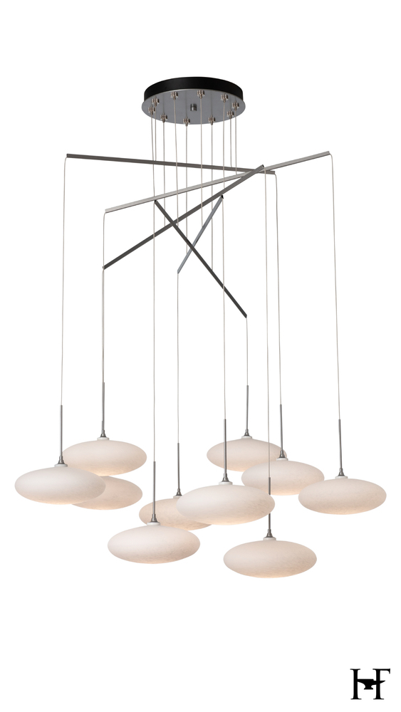 Beautiful white tortoise shell-like glass is shaped in a squashed sphere in this unexpected design resembling a cluster of clouds. Each piece of glass is cable-hung via a mobile created with delicate metal tubes allowing for a highly-adjustable design. The canopy is minimized while the breadth is expanded in an artful display of light.