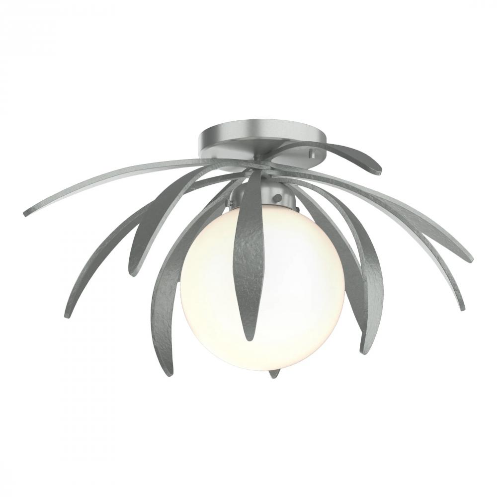True to the beauty of its namesake flower, the Dahlia Flush Mount fixture provides a sculptural botanic aesthetic. Handcrafted forged steel “petals” flare outward and downward to embrace a glass globe containing a singular light source at its center. Available in 9 standard finishes. In addition to the flush mount, the Dahlia Collection includes chandeliers and mini pendant options to grace any space. Can also be wall mounted as a sconce.