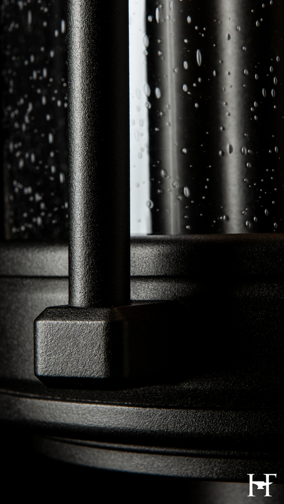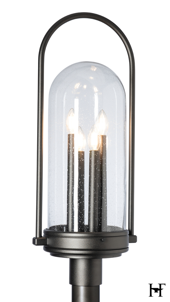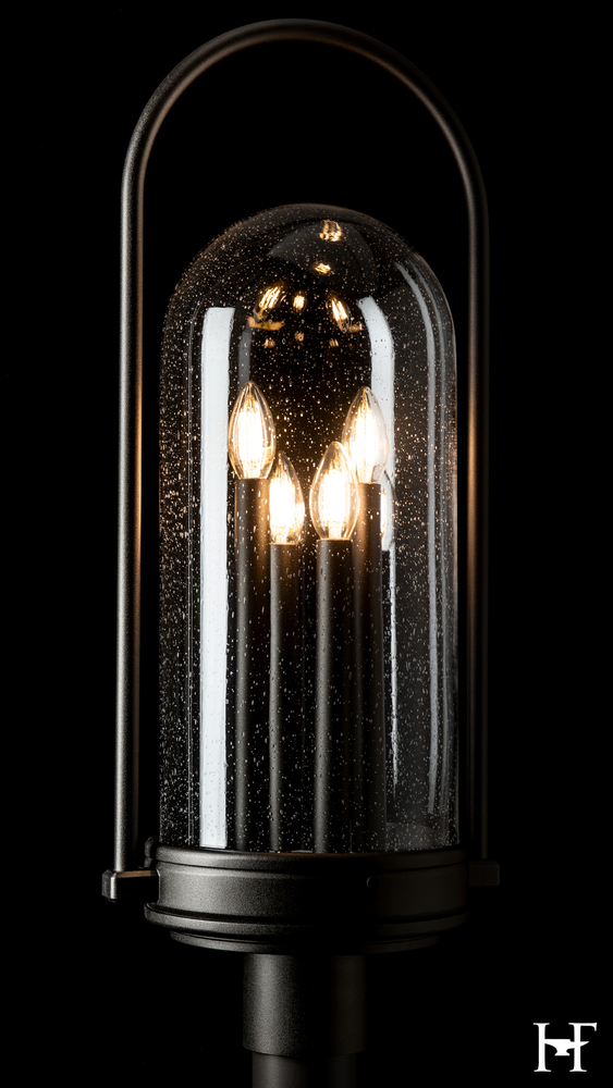 First impressions begin before guests arrive at the door. Four tall, exposed candlesticks are on display within the clear, seeded glass bell. The surrounding metalwork emphasizes this fresh interpretation of a traditional style. Coordinating accessories (post, pier mount) are sold separately. Available in a choice of AAMA 2604-rated Coastal Outdoor Finishes.