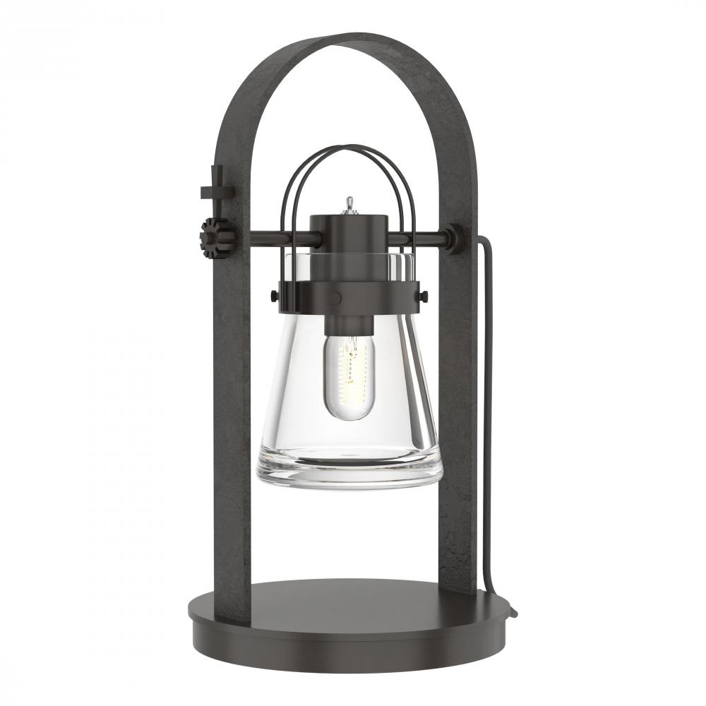 The clear, blown-glass flask of our Erlenmeyer Table Lamp is encircled by a handcrafted steel collar fixed to an arch within an arch. Angle can be adjusted with the steel cog locked by a steel pin - there's a touch of steampunk to the design.