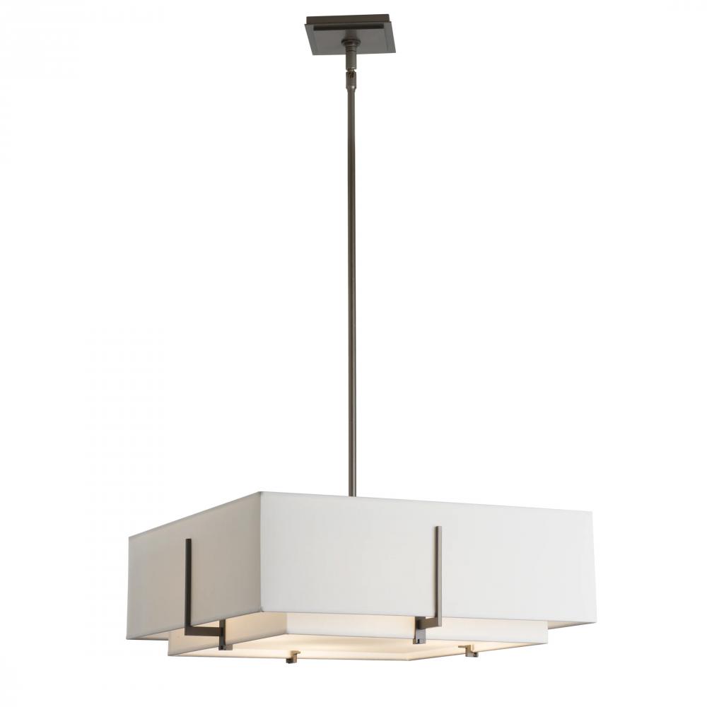 The double-shade design housing four bulbs in this square pendant delivers the sleek, clean and minimalistic elegance the Exos Collection is known for. Concentric shades are cradled by hand-forged steel bars.
