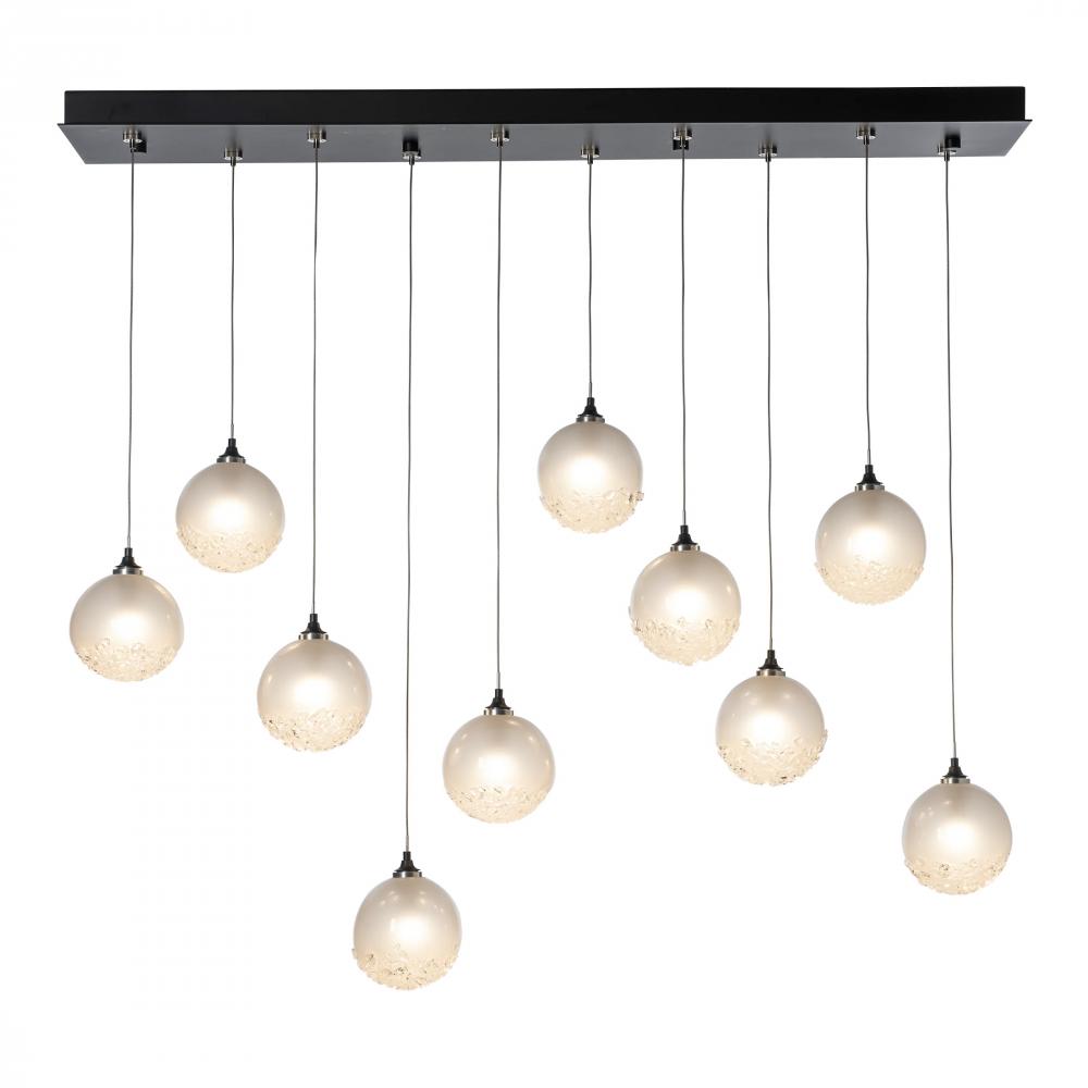 The Fritz Globe 10-Light Pendant is a stunning ceiling fixture that will add a touch of elegance to any space. The ten glass spheres are etched on the inside to provide more diffuse light, and the bottom of the outer glossy surface is covered in a heavily-textured fritted glass. This multi-port lighting fixture with its rectangular canopy allows you to customize the lengths and positions of each individual pendant, from aligned to staggered for effect.