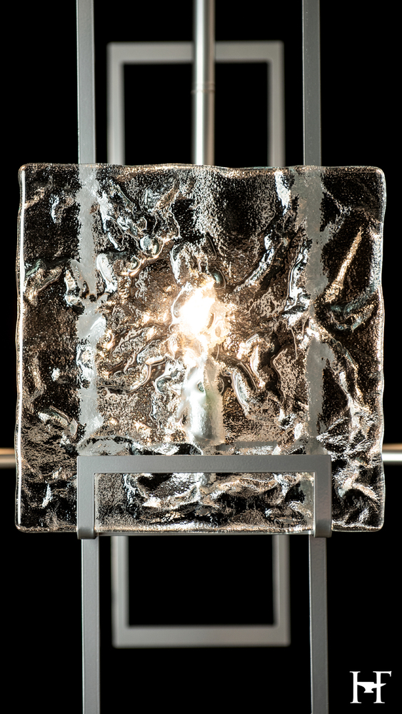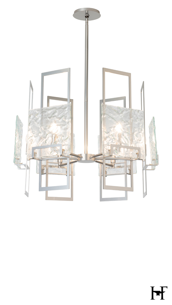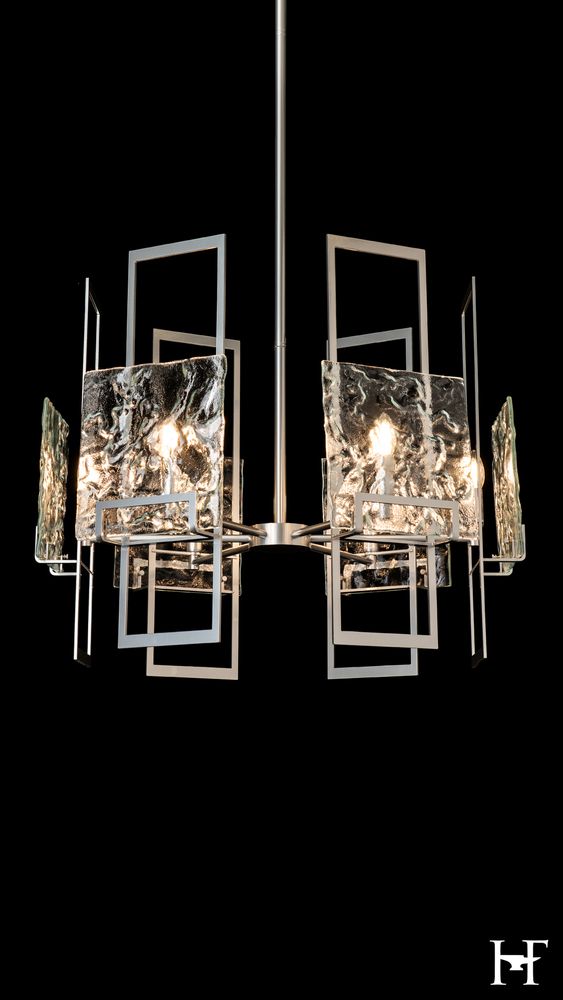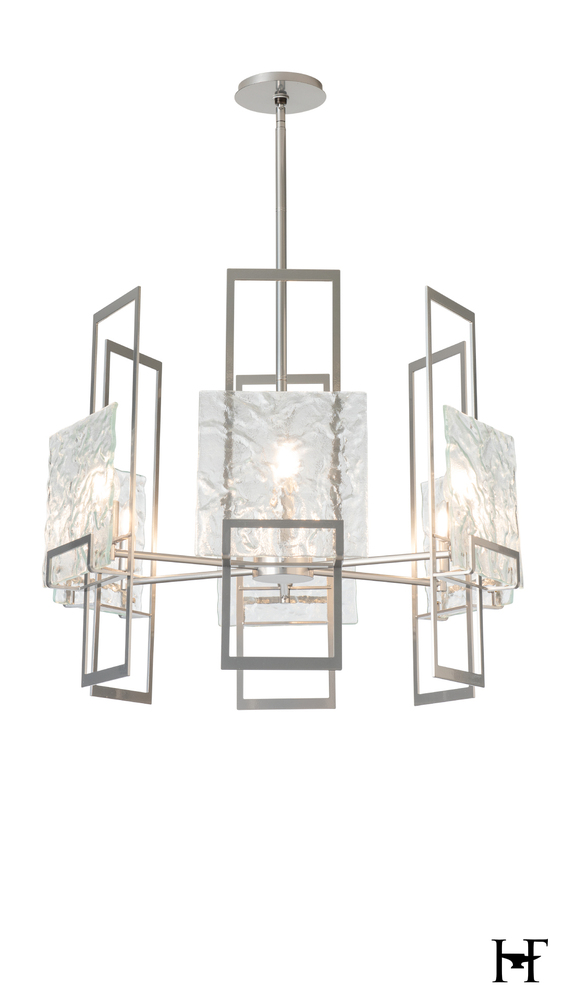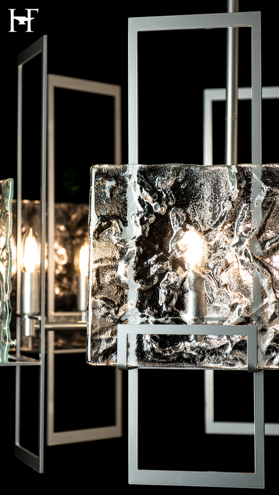 A juxtaposition of unique textured clear glass elements with tall vertical modern steel structures achieved the clean, contemporary lines that designer Ori Goldberg was seeking. The Geo 6-Light Pendant is perfect either alone or in multiples, making it easily adaptable to many spaces.