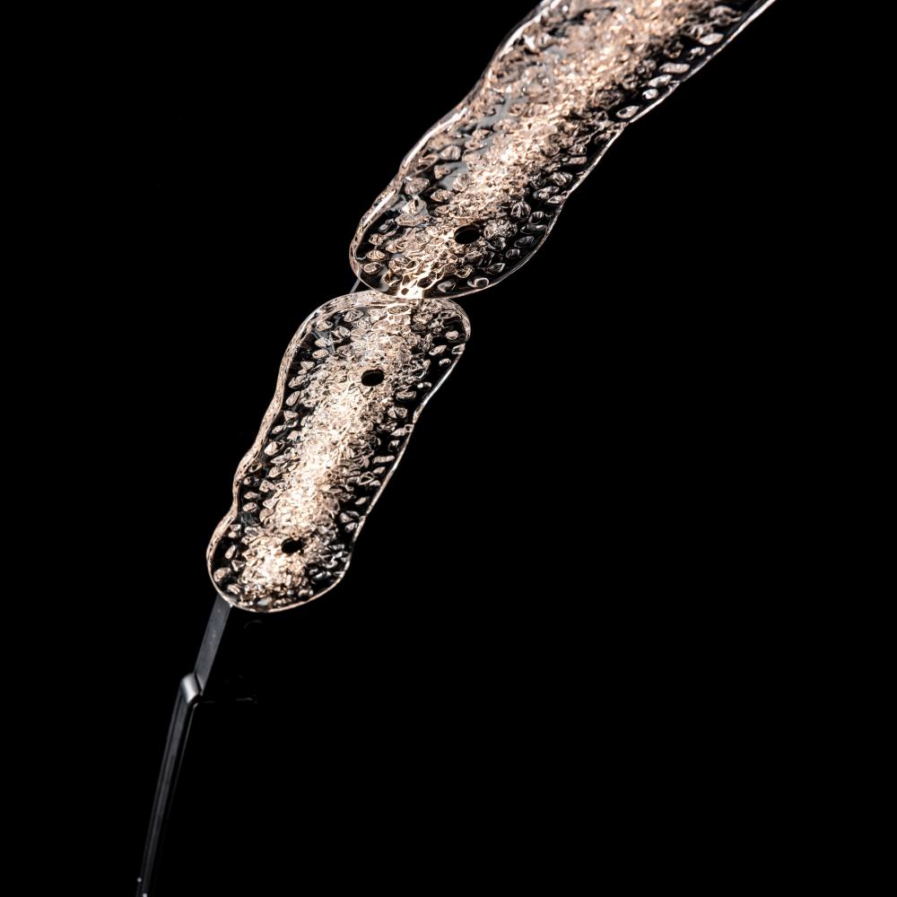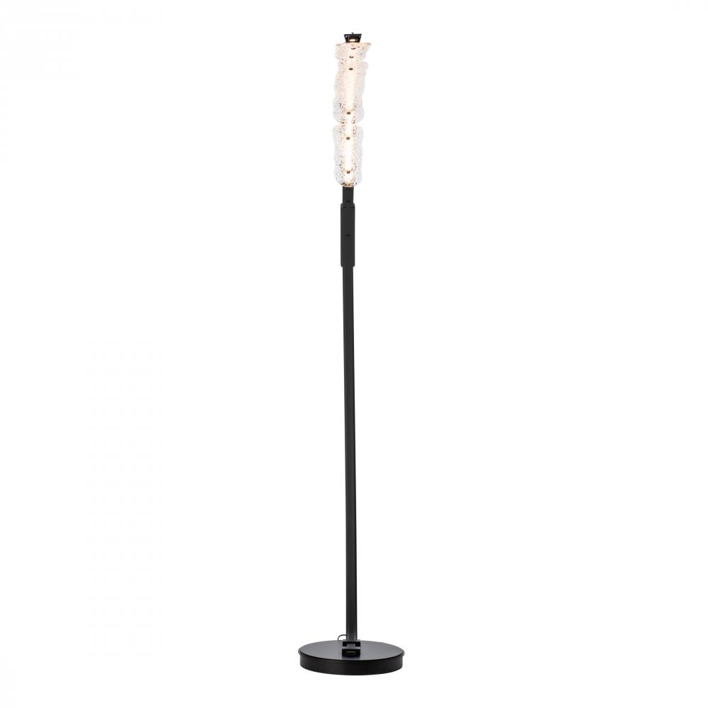 Three pieces of heavily textured handmade glass form the curved shape of the Glissade LED Arc Floor Lamp. "Walking across an icy pond in Iowa," said designer Andy Morter, "I was captivated by the clarity and natural geometry of the fractured pieces of ice where their jagged edges met the shoreline." A dimmer is perfectly located for easy access.