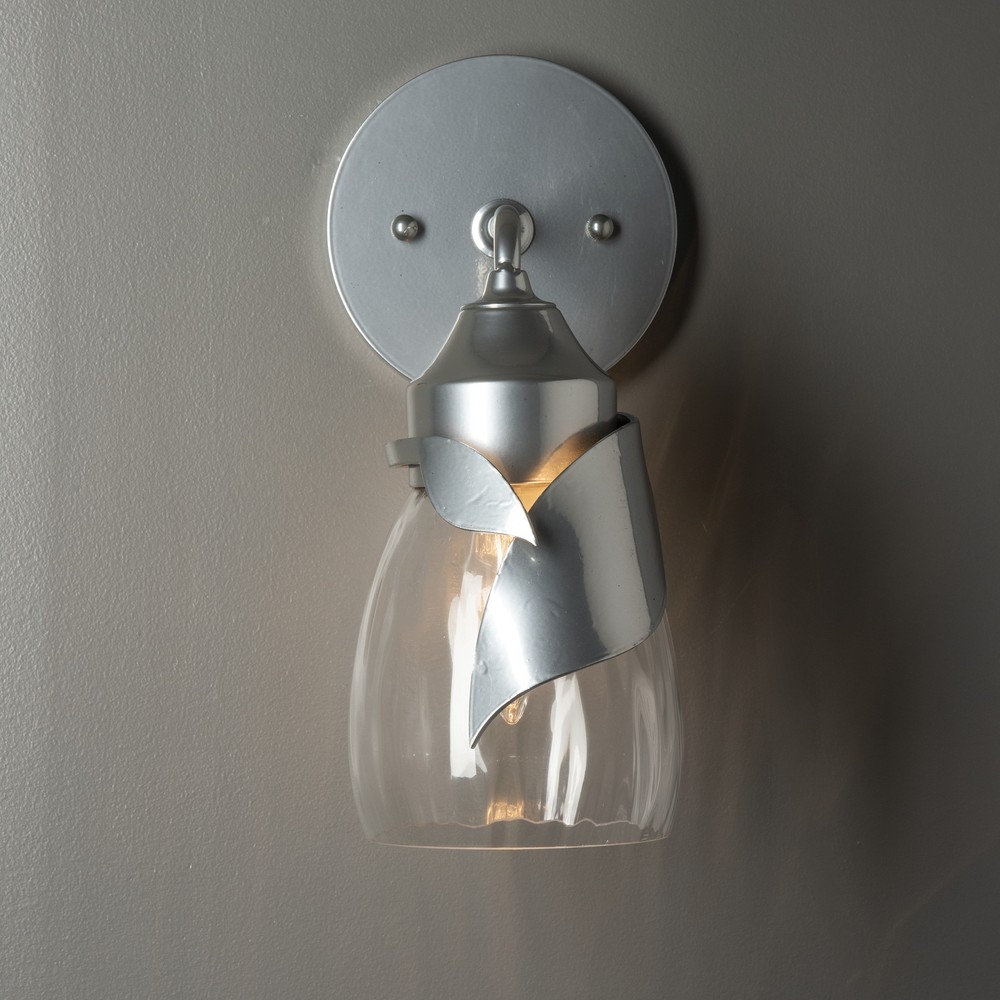 Able to be positioned for up- or downlight, the Lapas 1-Light Bath Sconce features a large and a small stylized leaf that embrace the glass shade. A single metal arm is angled from its small round backplate. Available in Black, Oil Rubbed Bronze, Vintage Platinum, Soft Gold, Sterling and Modern Brass.