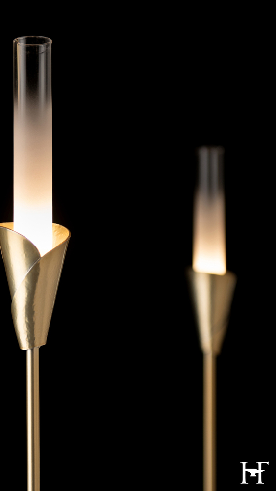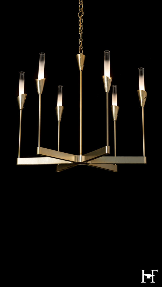 Stunning. The Lilium Collection, designed by Paul Marr Hilliard, incorporates an example of the expert artisanal work of our Vermont makers. Inspired by the clean lines of nature's Lily, each of this chandelier's six metal tiges culminates in a hand-forged and meticulously shaped substantial bobèche that nestles a tall gradient-frosted glass cylinder housing a light within.