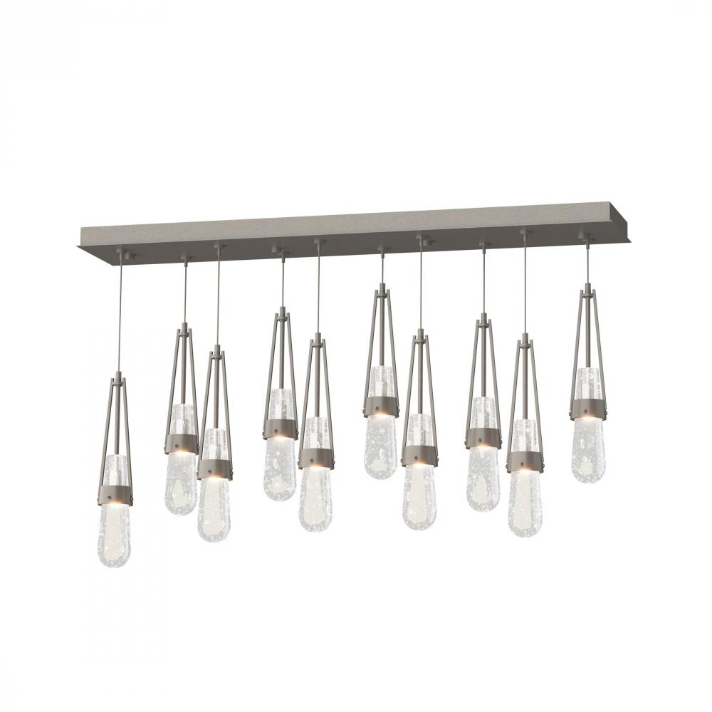 This linear Link multi-port fixture provides great customization options—the two rows of Link blown glass may be staggered or even, at a desired length from its rectangular canopy. Steel cuffs, handmade by Vermont artisans, embrace the glass of this Link 10-Light ceiling fixture. Handmade by local Vermont masters glass artisans, this Link's glass is offered in a choice of clear white threaded or clear bubble. Metalwork is available in all standard finishes.