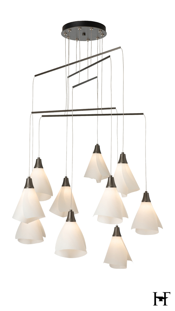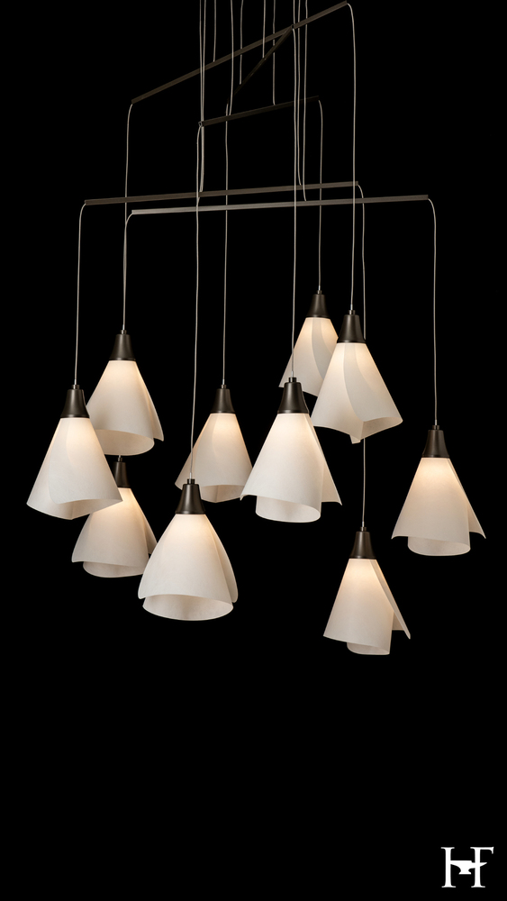 In a lovely floral-like display of spun white "petals", the Mobius 10-Light Mobile creates a beautiful effect with its elegant array of downlight. With its mobile platform minimizing its canopy needs, this Mobius can spread its light-print via the delicate metal tubes that guide each cable and allow for highly-adjustable designs. An artful balance of light and shape, the Mobius will light up any space.
